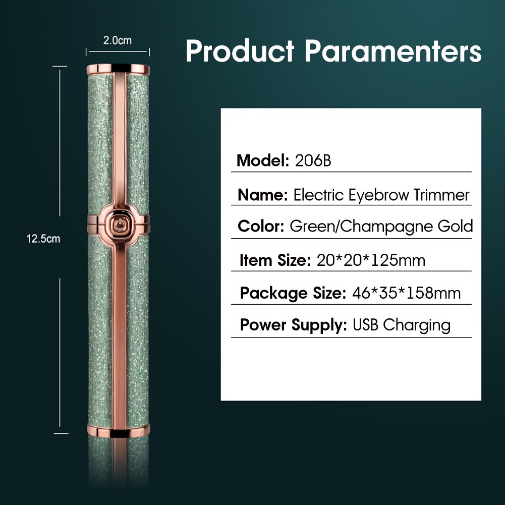 Features: 1.ã€Practical Design】Designed for refined eyebrow trimmings 2.ã€Fashion Body】It has a very shiny outlook which makes it pretty cool, with delicate frosted body. 3.ã€Detachable Cutter Head】The head is detachable for easy water wash,which is convenient to clean and can effectively prevent the growth of bacteria. 4.ã€USB charging】 you can charge it on your computer, in your car and any powered USB port, can be charged and used at any time. Specification: *Color: Green / Champagne Gold (Optional) *Material: ABS *Power supply: USB charging *Voltage: DC 5V *Power: 3W *Battery type: Ni MH battery 600mah 1.2V *Using time: About.60 minutes *Charging time: About.6 hours *Charging indicator: red light on while charging, green light on when fully charged *Item size: Approx.14*3*3cm *Package Weight: About.100g Package Includes: *1 x eyebrow trimmer *1 x USB charging cable *1 x cleaning brush *1 x users manual Note: 1.The real color of the item may be slightly different from the pictures shown on website caused by many factors such as brightness of your monitor and light brightness. 2.Please allow slight manual measurement deviation for the data.