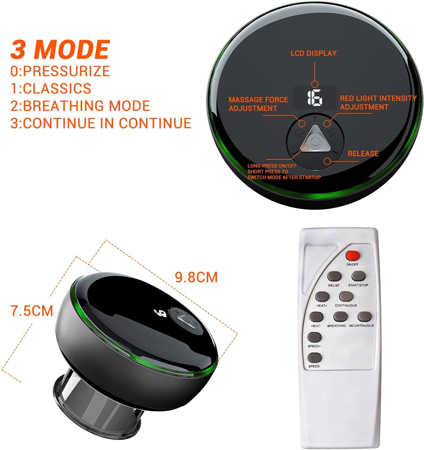 | 2 | 3 Modes & 16 Adjustable Suction---: Smart cupping set is fully upgraded, with dynamic cupping, shallow cupping and conventional cupping modes, 16 adjustable red light therapy and 16 suction, more intelligent and convenient. You can choose different temperature or intensity according to your needs, find the most suitable mode for you. |