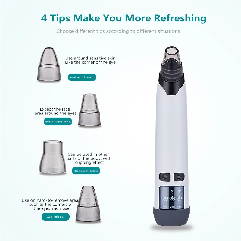 2. Built-in 3 adjustable suction levels and 4 interchangeable suction heads for free adjustment, widely suit different skin types and work on different skin areas, fully meet your custom pores cleaning demands.
